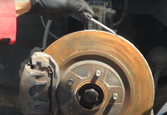 또 한 가지 볼 수 있는 증상은 브레이크 부분입니다. 우선 브레이크 디스크가 심하게 부식이 된 모습을 볼 수 있으며 정상적이라면 돌아가야 하는 디스크도 고착이 되어 돌아가지 않는 모습을 볼 수 있었습니다.