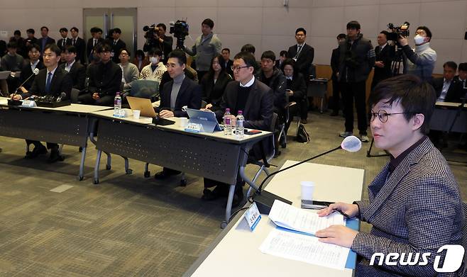 (서울=뉴스1) 김명섭 기자 = 전석재 슈카월드 대표가 13일 오전 서울 여의도 한국경제인연합회 컨퍼런스센터에서 열린 개인투자자와 함께하는 열린토론에서 사회를 보고 있다. 2024.3.13/뉴스1