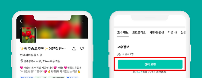 숨고 "이쁜집만들기" 고수님께 내가 받을 인테리어필름 시공 견적을 상담 받고 싶다면 고수님의 프로필 하단에서'견적 요청' 버튼을 눌러 보세요. 내가 원하는 시공에 대해 무료로 견적을 받아 볼 수 있어요.