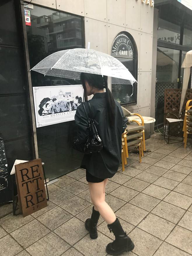 이 코디의 경우엔 투박한 부츠로 포인트를 주었답니다.