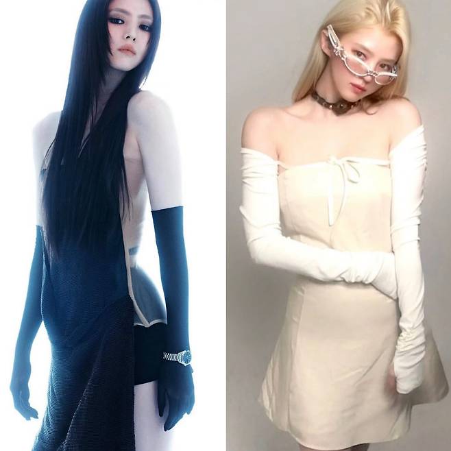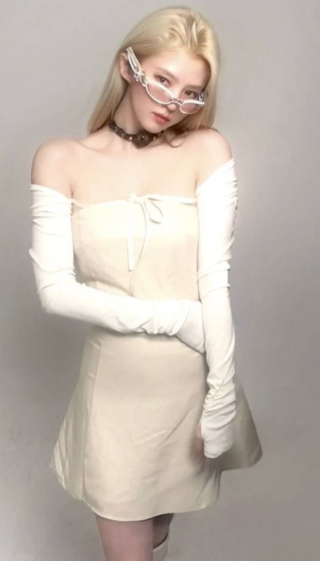 화이트 오프숄더 드레스에 롱 글러브와 메탈릭 선글라스를 더해 순수함 속 카리스마를 완성했어요. 클래식과 트렌드가 조화된 룩으로 ‘청순하면서도 도회적인 여신’이라는 표현이 절로 나옵니다.