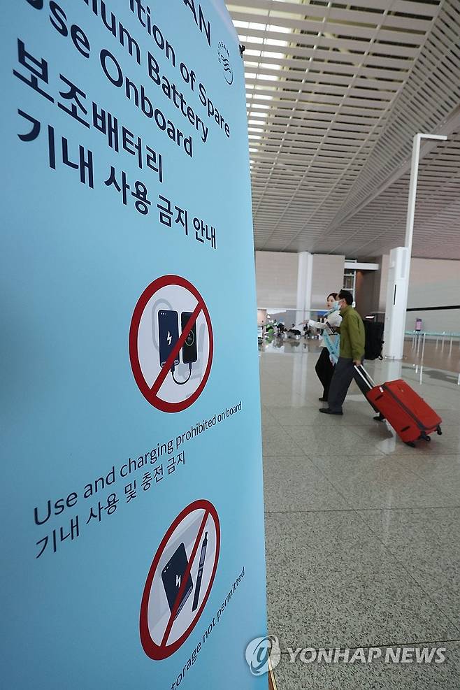 사진은 8일 인천국제공항 출국장에 설치된 보조배터리 기내 사용 금지 안내문.
