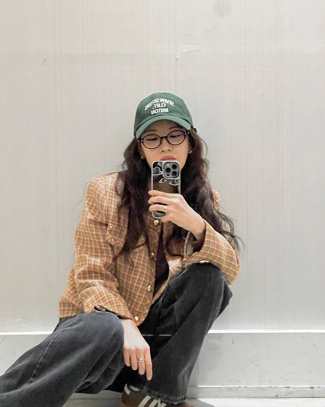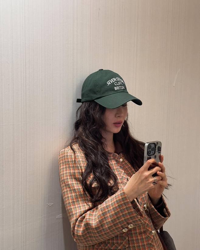 오렌지빛이 섞인 하운드투스 패턴의 체크 재킷은 단정하면서도 빈티지한 매력을 주고, 은은한 광택이 도는 골드 버튼이 고급스러움을 더해주고 있어요.