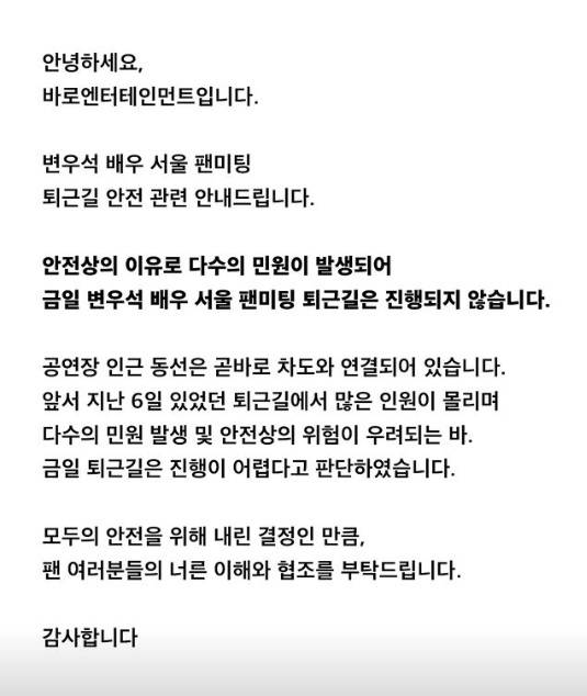 7일 변우석 소속사 바로 엔터테인먼트 측은 "퇴근길 안전 관련 안내드린다"는 공지와 함께 "안전상의 이유로 다수의 민원이 발생되어 금일 변우석 배우 서울 팬미팅 퇴근길은 진행되지 않는다"고 밝혔다.
