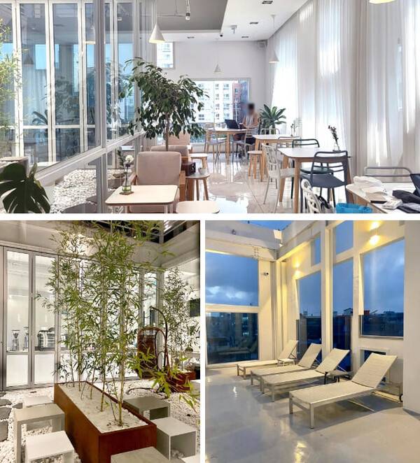 특히 루프탑 공간에는 깔끔한 화이트 톤의 인테리어에 썬베드가 자리하고 있어, 햇살 좋은 날 광합성을 즐기며 커피를 마시기 좋습니다.