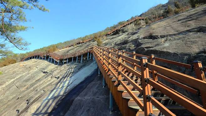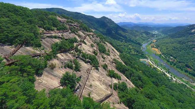 용궐산 하늘길의 시작은 ‘용궐산 치유의 숲’ 매표소다. 돌계단을 따라 20분 정도 오르면, 거대한 암벽에 매달린 나무 데크길이 눈앞에 펼쳐진다. 마치 설치 미술 작품 같은 이 길은 ‘잔도(棧道)’ 공법으로 만들어졌는데, 잔도란 험준한 벼랑에 선반처럼 매단 길을 뜻한다.