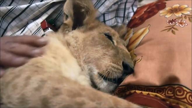 아저씨는 손수 이 아기 사자들을 재워주며 따뜻하게 보살펴 줍니다.