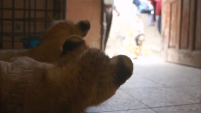 집안으로 들어가니 어디서 온 것인지 귀여운 새끼 사자 두 마리가 엎드려 사람들을 보고 있습니다.