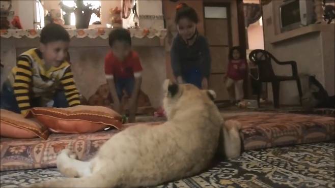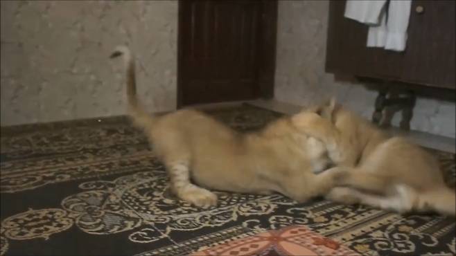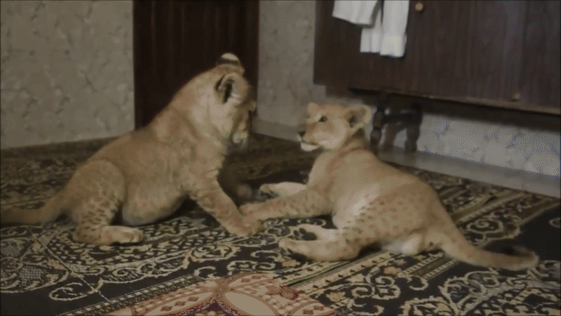 아기 사자들은 이제 이빨이 자라기 시작하는지 집안의 양탄자를 물어뜯으며 놀고 있는데요.