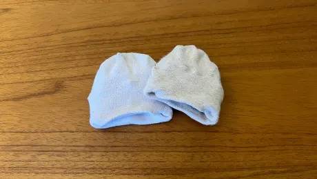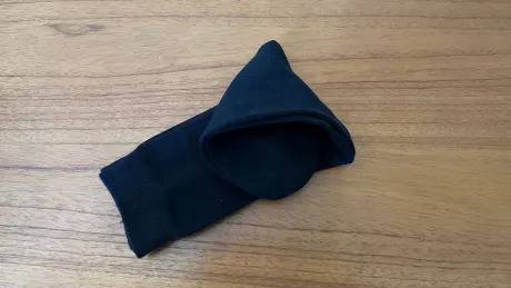 발목 부분을 삼각형이 만들어 진 부분의 틈새에 끼워 넣으면 완성입니다. 이렇게 접으면 밴딩을 사용하지 않았기 때문에 발목이 늘어나는 것을 막을 수 있습니다.