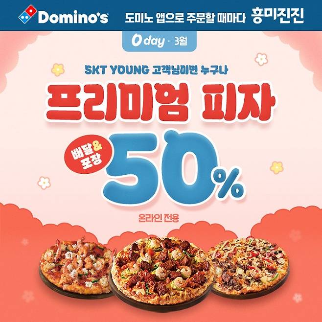 도미노피자가 SK텔레콤 T멤버십 고객 중 13세~34세 고객들에게 포장 및 배달 50% 할인 혜택을 적용 받을 수 있는 'SKT 0 day' 프로모션을 진행한다고 9일 밝혔다.