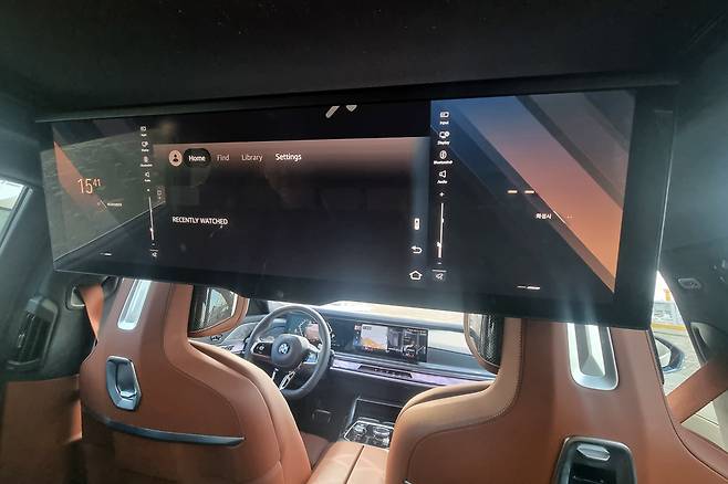 외계인이 만들었다는 천장에서 내려오는 씨어터 스크린은 31인치로 눈을 휘둥그레 하게 만든다. 1열 헤드레스트에 간섭을 피해 하단으로 펼쳐져 즉석에서 영화관을 만들어 준다. 세로 대비 가로 길이가 길어 완전하게 영상을 크게 볼 순 없지만 세계를 깜짝 놀라게 만들었던 새로운 시도인 만큼 가치는 충분하다.