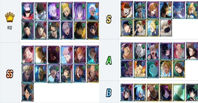 0티어로 평가받는 고조 사토루는 공격 무효화 버프와 강력한 필살기로 스토리 진행에 탁월하며, SR 등급의 야가는 전체 아군 술식 채수를 높이고 적군을 약화시키는 능력으로 주목받습니다.