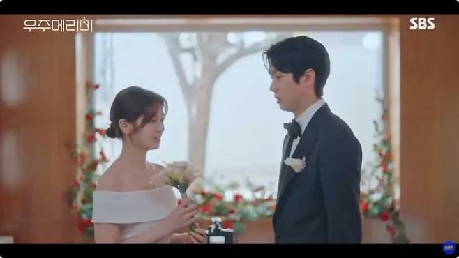 이 소식을 들은 우주는 “사기를 치려면 각오부터 해야지”라며 투덜대면서도 결국 메리를 도왔다. 말은 차가웠지만 행동은 따뜻했다. 두 사람은 들키지 않기 위해 웨딩 사진 촬영을 감행했다. 웨딩드레스를 입은 메리를 본 우주는 시선을 떼지 못했고, 그 장면은 시청자의 입꼬리를 올리게 했다.