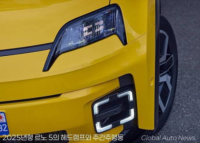 그래서 최신형 르노 5의 헤드램프는 마치 옆으로 돌려놓은 디귿(ㄷ)의 형태이지만, 렌즈 안쪽에 네 개의 기역(ㄱ) 형태의 연결로 만들어진 사각형 그래픽이 들어가 있고, 범퍼에는 역시 네 개의 ㄱ 으로 사각형을 구성한 주간주행등이 디자인돼 있습니다. 저렇게 만들어진 앞 모습 전체 인상은 어딘가 중세 유럽의 투구처럼 보이기도 하지만 디지털 이미지도 풍깁니다.