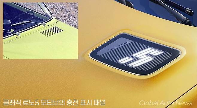 이런 요소는 후드에도 있습니다. 후드 윗면에 숫자 5가 새겨진 전기 충전 상태 표시 디스플레이 패널이 설치돼 있습니다. 이 부분은 클래식 르노5의 후드에 뚫려 있던 환기구를 모티브로 만든 장식적 디자인 요소지만, 단순한 장식이 아닌 기능적 요소로서의 표시 패널입니다.