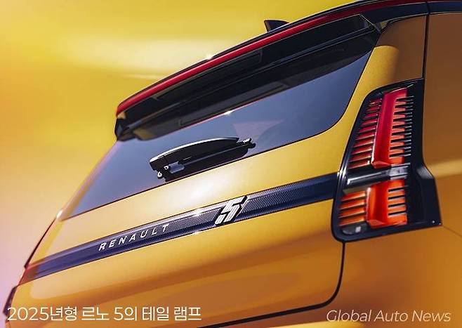 휠 아치는 둥근 형태이지만, 앞뒤 펜더에 직선 형태의 휠 아치 캐릭터 라인으로 클래식 르노5의 사각형 휠 아치 형태 모티브를 보여줍니다. 또한, 신형에서는 클래식 모델의 사각형 헤드 램프와 C-필러에 길게 디자인된 환기구와 그 아래쪽의 테일 램프를 모티브로 한 디테일을 볼 수 있습니다.