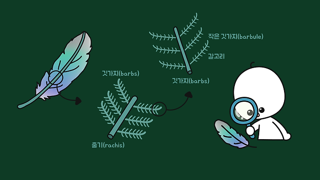 조류 깃털의 세부 구조를 살펴보면 중심을 잡아주는 줄기(rachis)가 있고, 양쪽으로 깃가지(barbs) 있습니다. 그리고 깃가지 양쪽으로 작은 깃가지(barbule)가 있고, 작은 깃가지 양쪽으로 또 미세한 갈고리가 있습니다.