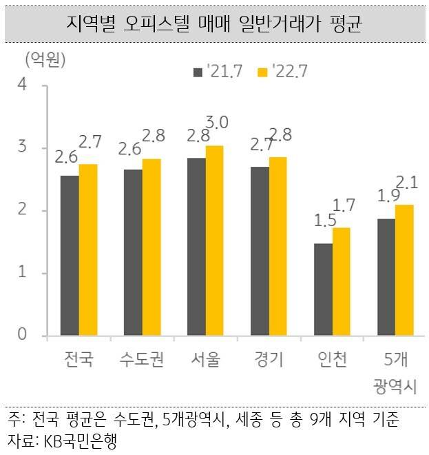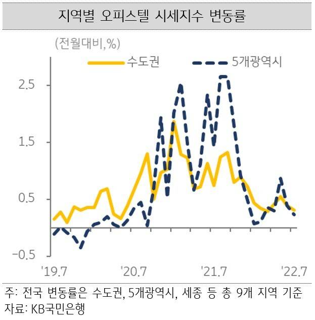 전국 오피스텔 가격은 전월 대비 0.3%p 상승하면서 전월과 동일한 흐름을 유지하고 있습니다. 수도권 오피스텔 매매가격은 전월 대비 0.3% 상승하면서 0.1%p 하락했습니다. 주택시장 침체 영향으로 5개광역시 상승폭은 전월 대비 절반인 0.2%로 축소됐습니다.