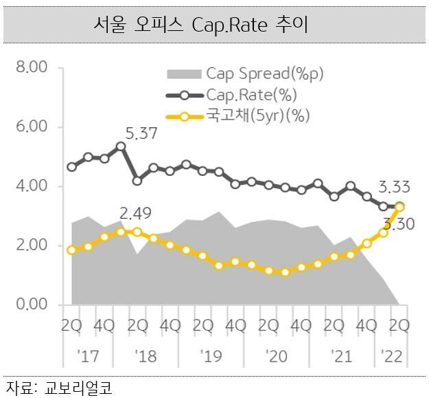 거래면적 감소에도 불구하고, 제한된 공급과 지속되는 수요로 오피스 Cap.Rate는 안정세입니다. 2분기 중소형 오피스 위주의 거래로 거래면적 줄었으나, 3분기에 IFC등 대형빌딩이 거래될 예정입니다. 임대료 상승 가능성이 큰 오피스의 경우 매입 초기수익률이 국고채(5년) 수준에서도 거래가 이루어지고 있습니다.