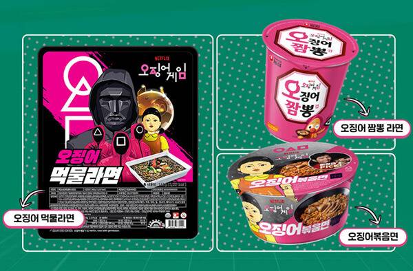 편의점 GS25는 넷플릭스 오리지널 시리즈 오징어게임과 손을 잡고, 콜라보 라면 제품 3종을 출시했다. 점보 사이즈로 출시된 ‘오징어 먹물라면’과 칼칼한 맛이 매력적인 ‘오징어 볶음면’의 신제품 2종, 그리고 농심 오징어짬뽕의 특별 패키지 제품까지 3종이다. 3종 신제품 중에서도 눈길을 끄는 것은 ‘오징어 먹물라면’으로, 점보 사이즈 제품으로 여럿이 넉넉하게 즐길 수 있다. 오징어 먹물라면의 판매가는 9,900원이다.
