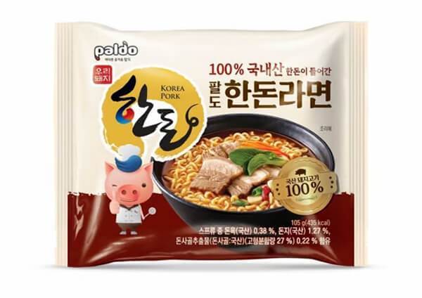팔도는 한돈자조금관리위원회와 공동 연구, 개발해 만든 첫 제품 ‘팔도 한돈라면’을 출시했다. 팔도와 한돈자조금은 한돈 소비 촉진을 위한 업무협약을 맺은 바 있다. 이번 제품은 오랜 시간 우려낸 돼지 사골 육수를 첨가해 구수한 맛이 특징이다. 100% 국내산 돼지고기를 볶아 만든 분말로 감칠맛을 살렸으며, 간장, 된장 등 전통 양념을 사용해 풍미를 높였다. 대형마트 기준 4봉들이 팩의 판매가는 3,480원이다.