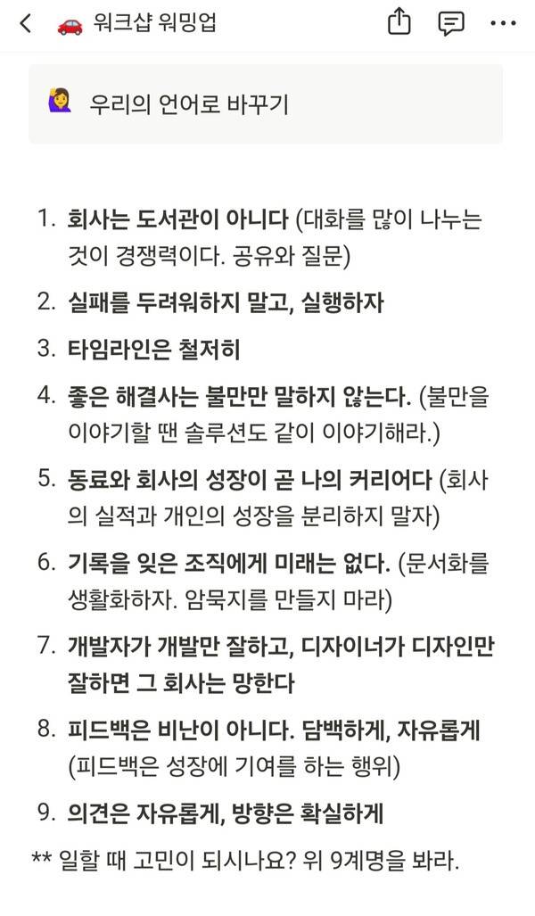 김 대표: 최근에 3주 동안 논의한 십계명이 확정됐어요. 1번 규칙은 ‘회사는 도서관이 아니다. 잡담을 많이 나누는 것도 경쟁력이다’예요. 이 규칙과 관련해서 3개월에 한 번씩 저와 모든 팀원이 1o1(One on One) 시간을 가지면서 소통을 최대한 많이 하고 있어요. 누군가는 부담스럽게 생각할 수도 있지만, 저희 팀원들은 오히려 적극적으로 많이 요청해 주셔서 최소한 3개월에 한 번씩 진행하면서 업무, 커리어, 일상적인 부분에서 더 나은 방향으로 할 수 있게끔 같이 고민하는 시간을 보냅니다.