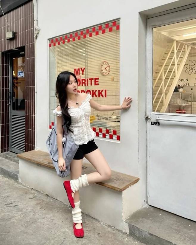 샌들이나 플랫슈즈를 더하면 러블리한 감성이 강조됩니다.