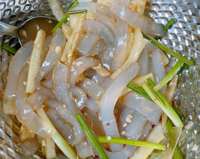 - 묵 데치기: 청포묵을 적당한 크기로 채 썰어 끓는 물에 넣고 투명해질 때까지(약 1분) 데친 후 찬물에 헹궈 물기를 뺍니다.