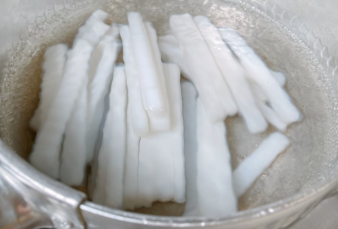 마트에서 구입한 청포묵은 시간이 지나면 뻣뻣해질 수 있으므로, 반드시 끓는 물에 데쳐 사용하는 것이 좋습니다. 데친 묵은 탱글탱글한 식감을 되찾게 됩니다.