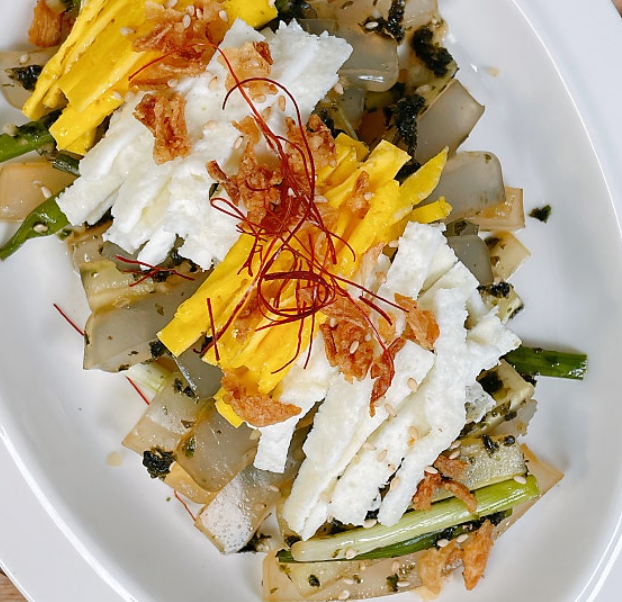 - 묵 데치기: 청포묵을 적당한 크기로 채 썰어 끓는 물에 넣고 투명해질 때까지(약 1분) 데친 후 찬물에 헹궈 물기를 뺍니다.