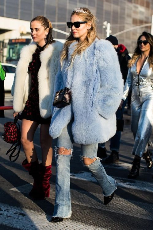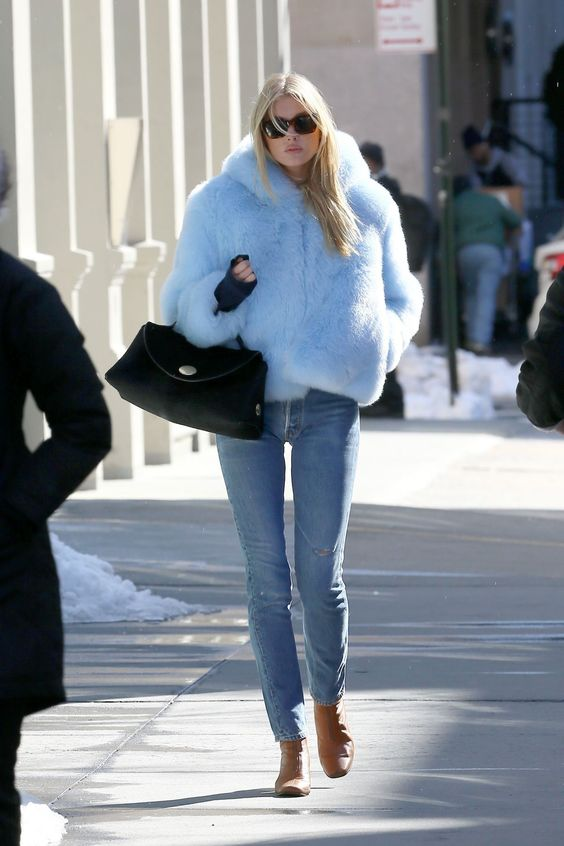 블루 컬러의 퍼자켓 + 청바지로