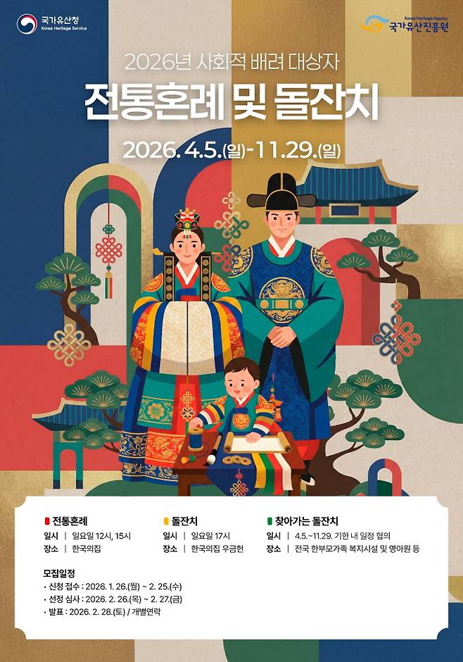 '2026년 사회적 배려 대상자 전통혼례‧돌잔치 지원' 참여자 모집은 1월 26일부터 2월 25일까지 진행되며, 신청 방법과 세부 사항은 국가유산진흥원 누리집 또는 국가유산진흥원 한류사업기획팀을 통해 확인할 수 있다.