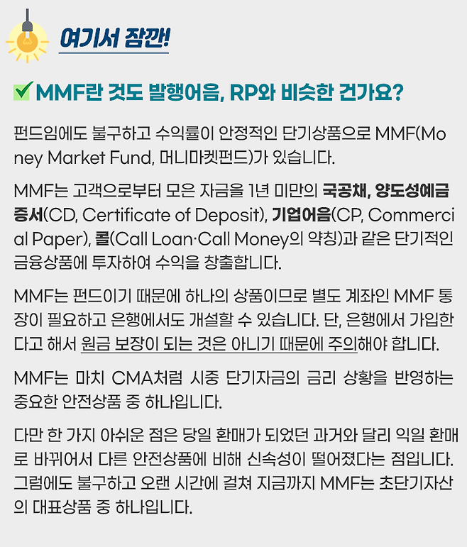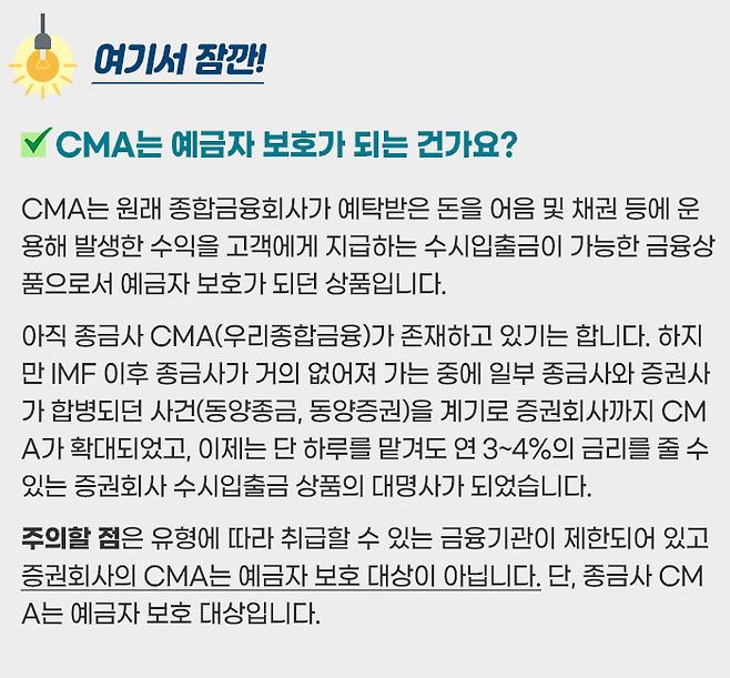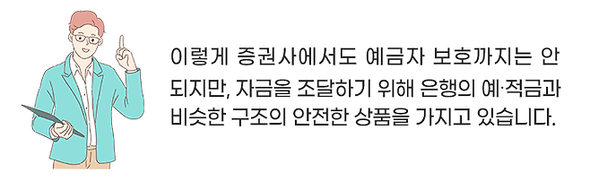 주의할 점은 우량한 채권을 담보로 하기 때문에 비교적 안전하다고 할 수 있지만 발행어음과 마찬가지로 예금자 보호 대상은 아니라는 점입니다.