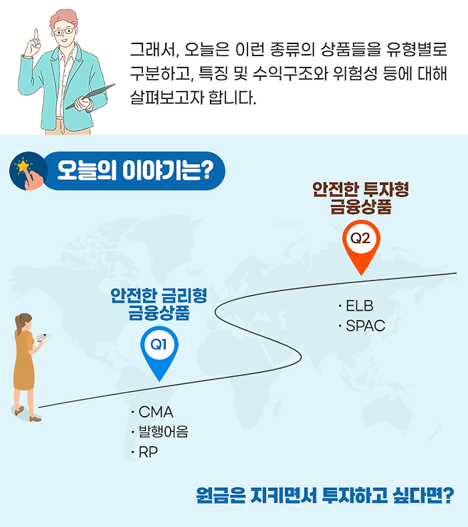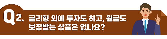 이런 경우에 보통 다른 업권에서 손실 우려가 없는 금리형 상품에 우선 관심을 갖게 됩니다. 그리고, 더 나아가서 수익률이 좀 더 높은 투자형 상품이지만 위험하지 않고 손실이 거의 발생하지 않을 원금 보장형 금융상품을 찾게 되는 것이 일반적인데요.
