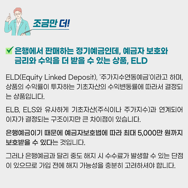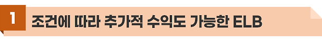 ELB는 원금을 보장하고 대부분 약정된 수익률을 가져갈 수 있어 주가나 지수 하락 위험을 회피하는 헤지(hedge) 수단으로 활용할 수 있습니다. 또한 연계된 상품의 수익에 따라 추가 수익이 발생할 수도 있습니다.
