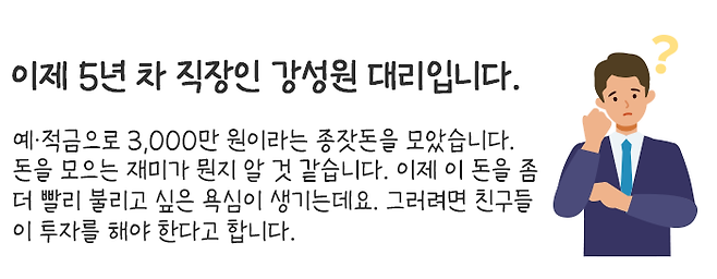 근데, 투자라는 게 잘못하면 원금도 손해를 볼 수 있잖아요. 투자로 돈을 빨리 모으는 것은 좋지만, 어렵게 모은 돈을 손해보기는 싫습니다.