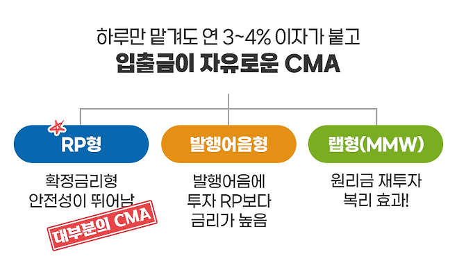 이자수익을 내기 위한 방법(운용 대상 자산)에 따라 CMA 옆에 발행어음형, RP형, 랩형이라는 부제를 달기도 하고 그 자산에 따라 이익을 얻는 세부 절차는 다소 차이가 있을지 모르나 자유로운 수시입출로 인해 얻는 효용성은 동일하고 수익률도 거의 유사합니다.