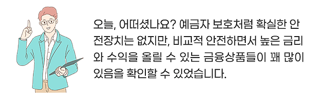 이런 금융상품들을 알아두시면 원금 손실에 대한 걱정도 덜할 것이고 돈을 불리는 것도 좀 빠를 수 있을 것입니다.