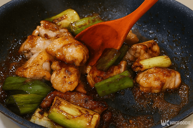 파 향이 올라오기 시작하면 설탕 1스푼, 굴 소스 1스푼, 돈가스 소스 1스푼을 넣는다. 세 가지 양념은 단맛, 감칠맛, 산미가 고르게 섞여 편안한 맛을 만든다. 양념을 넣은 뒤 섞어주고 물 2스푼에서 3스푼을 넣어 자작하게 만든다. 물을 너무 많이 넣으면 닭고기가 질겨지므로 적은 양만 사용하는 편이 좋다. 양념이 닭고기 표면에 고르게 붙고 윤기가 생기면 불을 끄고 잠시 두어 속 수분이 가라앉도록 한다.