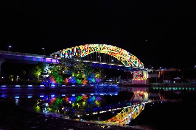 1998년 준공된 통영대교는 구조물 노후화에 따른 안전개선과 도시경관 재정비를 거쳐 27년 만에 새롭게 단장됐다. 이번 리모델링에서는 지역 출신 현대미술 거장 전혁림 화백의 대표작 ‘풍어제’를 교량 전체에 구현해 예술성과 상징성을 동시에 갖춘 ‘바다 위의 예술 작품’으로 재탄생했다.