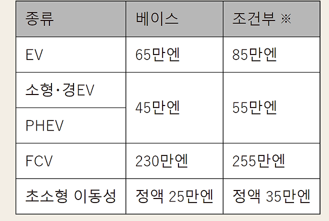 이 기준에 따라 일본산 전기차인 스바루 솔테라(시판가격 594만 엔), 토요타 전기차 bZ4X(600만 엔), 닛산 아리야 B6(539만 엔), 닛산 리프 e+(525만3,600엔) 렉서스 UX300e 등 일본 전기차는 모두 최고 금액인 85만 엔을 받는다.