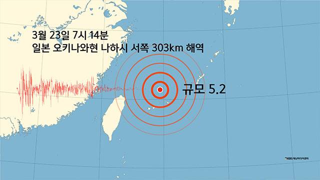 오늘(23일) 아침 7시 14분에 일본 오키나와현 나하시 서쪽 303km 해역에서 규모 5.2의 지진이 발생했다고 기상청이 외국 관측 기관 등을 인용해 전했습니다.