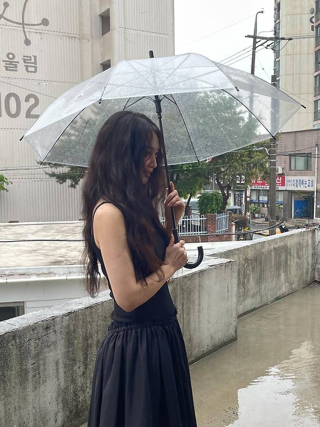 심플한 블랙 슬리브리스 원피스와 긴 웨이브 헤어, 투명 우산 조합은 마치 90년대 영화 속 한 장면처럼 감성 폭발.