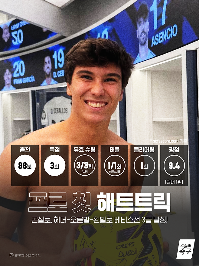 하지만 베티스라는 난적을 상대로 해트트릭을 기록하면서 음바페의 빈자리를 확실히 메웠고, 레알 공격진의 새로운 대안으로 떠올랐다. 이제 모두가 머리, 오른발, 왼발 등 온몸을 무기로 득점에 성공한 그에 대해, 아니 새로운 영웅의 등장에 흥분하고 있다.