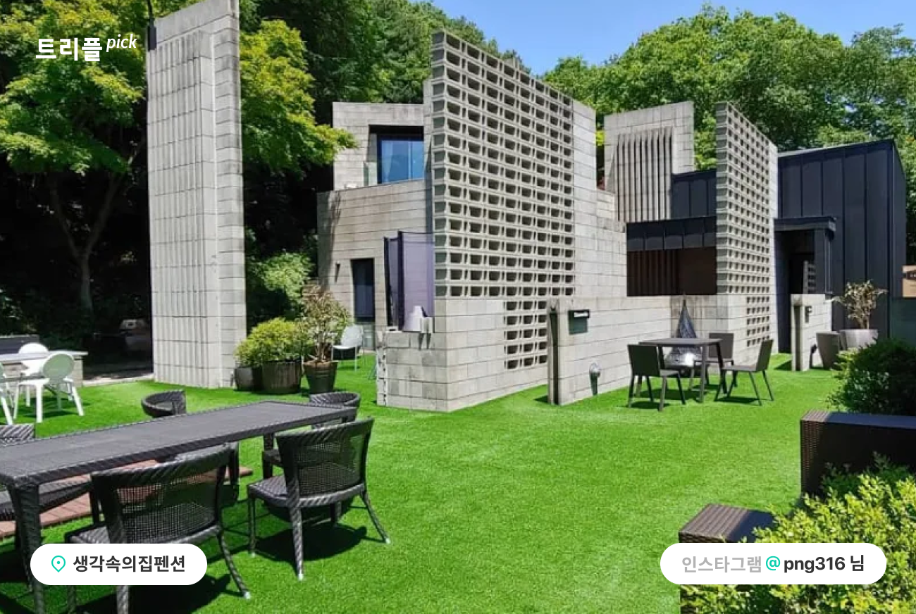 콘크리트 벽돌로 이루어진 독특한 외관부터 시선을 사로잡는 곳. 전문 건축가가 디자인한 펜션으로 건축문화대상 등 각종 건축상을 받기도 했다.