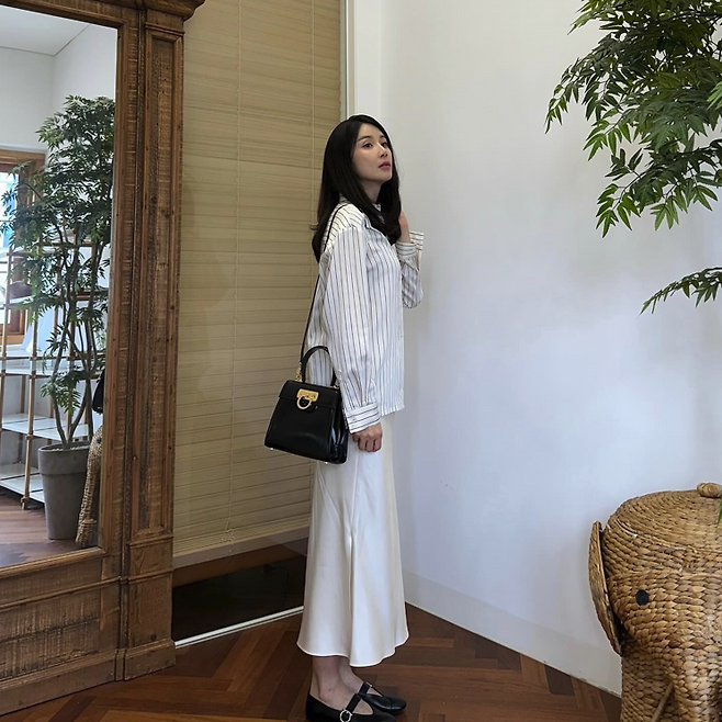 올 화이트 룩으로, 새틴 소재인 미디 스커트에 스트라이프 패턴이 들어간 셔츠로 코디한 이보영 옷 패션 스타일 우아하죠? 발끝에는 블랙 플랫슈즈로, 가방도 블랙으로 깔맞춤 했는데요.