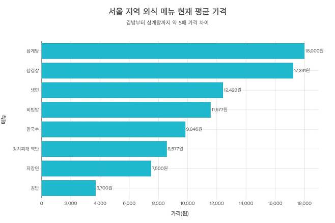 [ 현재 서울 지역의 외식 메뉴 평균 가격을 비교하면 칼국수는 1만원에 가깝고, 삼계탕은 1만8천원에 달하는 것으로 나타났다.]