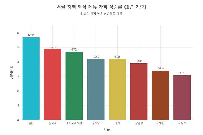 한국소비자원 가격정보포털 '참가격'의 자료에 따르면 지난달 기준 서울 지역 소비자 선호 외식 메뉴 8개의 평균 가격은 전년 11월 대비 3~5%대 상승했다. 특히 가격이 저렴한 서민 외식 메뉴의 상승률이 두드러졌다. 김밥은 3,500원에서 3,700원으로 5.7% 올라 가장 높은 상승률을 기록했으며, 칼국수는 9,385원에서 9,846원으로 4.9% 상승해 1만원 돌파를 눈앞에 두고 있다. 김치찌개 백반도 8,192원에서 8,577원으로 4.7% 올랐고, 삼계탕은 4.2% 상승해 1만8천원 수준으로 올라섰다.