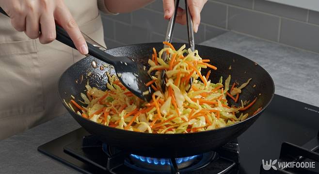 5. 당근이 살짝 투명해지면 양배추를 넣는다.